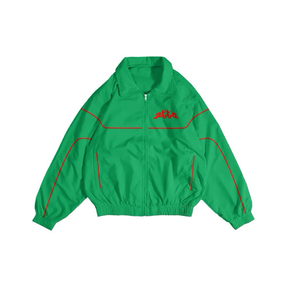 Green nylon jacket with red piping. Signature graphic in red printed on back and front. Cut & sewn, double stitched, reinforced panels (horizontal)