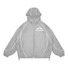 Pewter nylon hooded zip up windbreaker with graphic screen printed on left. 3M piping throughout front and back. Ribbed cuffs and hem. Internal syncing support system with double barrel lock by HydraQuiver™.